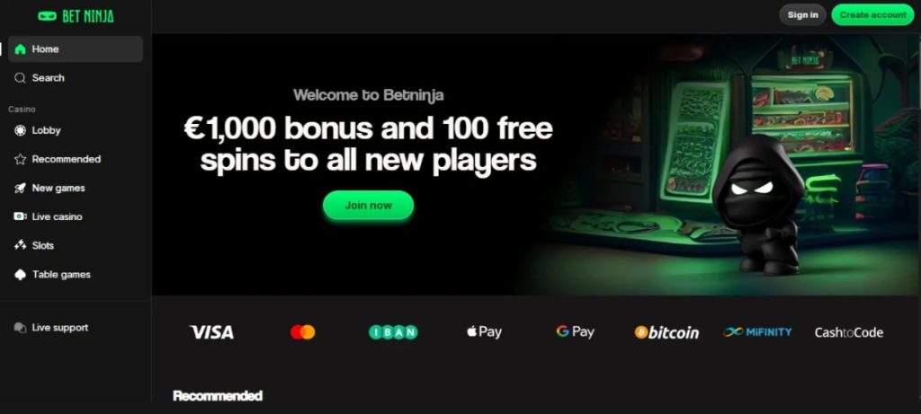 The welcome offer can reach up to €1,000 plus free spins, making it appealing for first time deposits. Payment support is strong, with crypto, credit cards and e wallets all available. BetNinja is popular with players who prefer simple navigation and clean visuals rather than overly busy layouts.